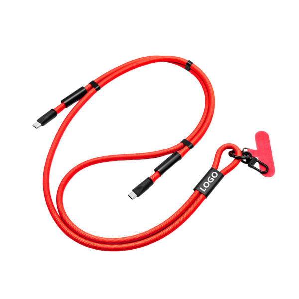 Kleurrijke lanyard oplaadkabel met smartphonehouder. USB Type-C naar Type-C aansluiting + Apple Lightning adapter. Snel opladen en gegevensoverdracht tot 5A /100W. Hanger met Lightning-adapter voor Apple inbegrepen in de prijs Personalisatie is mogelijk op de metalen slider en optioneel op de smartphonehouder.