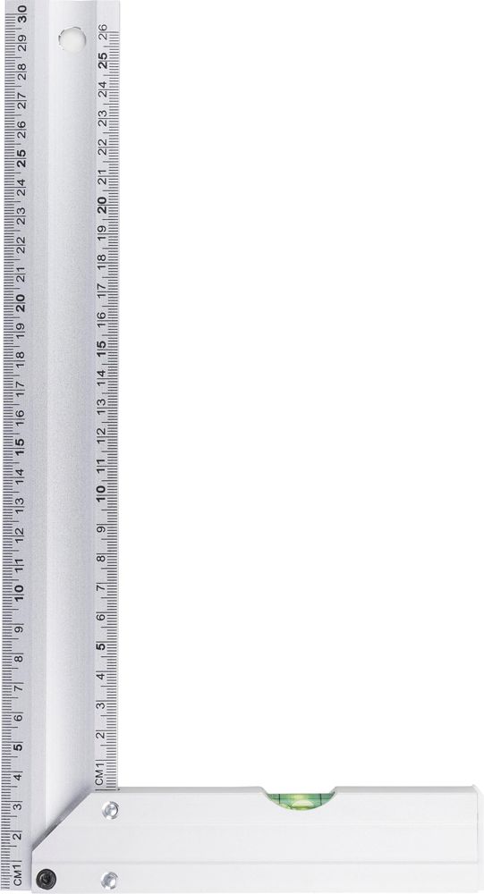 Aluminium winkelhaak met geïntegreerde waterpas. Lengte 30?centimeter met duidelijke centimeterverdeling. Praktisch ontwerp voor nauwkeurig meten en waterpassen. Individueel verpakt in een bruine kartonnen doos met illustratie.
