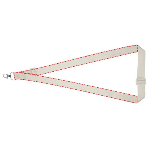 RPET-lanyard met schuifgesp om de lengte comfortabel aan te passen en een metalen haak om een naamkaartje, ID-kaart of sleutels te bevestigen. Kan enkel- of dubbelzijdig bedrukt worden, met keuze uit standaard of fitted dubbelzijdige bedrukking (bij fitted sluiten de ontwerpen aan beide zijden naadloos aan). Gemaakt in Europa.