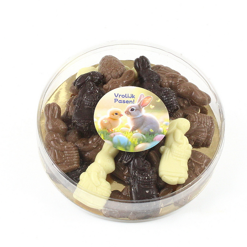 Een feestelijk paasgeschenk voor echte chocoladeliefhebbers. Dit transparante geschenkdoosje is rijk gevuld met een vrolijk assortiment échte Belgische paaschocolade in de vorm van haasjes, konijntjes, eitjes en andere paasfiguren 200 gram. Gemaakt van witte, melk- en pure chocolade. Het ronde doosje is voorzien van een ronde sticker met “Vrolijk Pasen”-print, wat zorgt voor een frisse en feestelijke uitstraling. Dankzij de mooie presentatie is dit chocoladegeschenk perfect als paasattentie, relatiegeschenk of traktatie tijdens de paasdagen. Het is mogelijk om de paassticker te personaliseren, bijvoorbeeld met een logo, naam of eigen paasboodschap. Vraag naar de mogelijkheden, wij denken graag met je mee. Besteleenheid: 18 stuks. Levertijd in overleg.