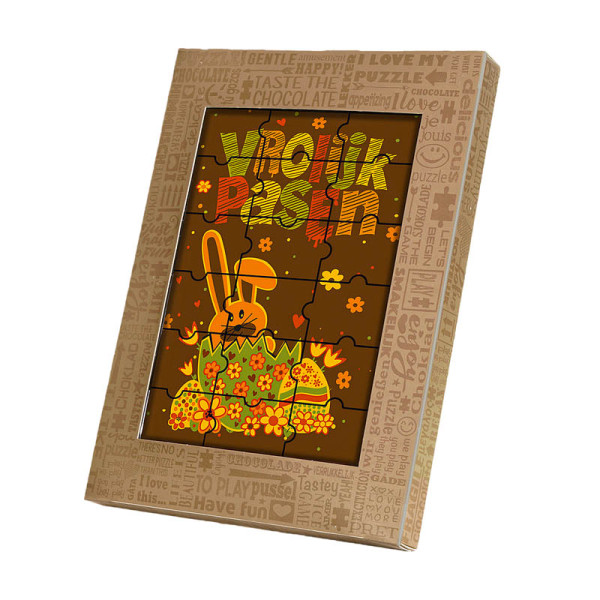 Een speels én smakelijk paasgeschenk! Deze originele chocolade paaspuzzel combineert plezier met verwennerij. De puzzel is volledig gemaakt van heerlijke chocolade en voorzien van een vrolijke paasillustratie. Eerst puzzelen, daarna genieten – of allebei tegelijk. De chocoladepuzzel is verpakt in een stevige geschenkverpakking, waardoor hij perfect geschikt is om cadeau te geven tijdens de paasdagen. Leuk voor jong en oud, als paasattentie, relatiegeschenk of originele traktatie. Besteleenheid: 12 stuks. Uiterste besteldatum: 02-03-2026. Leverbaar vanaf 25-03-2026.