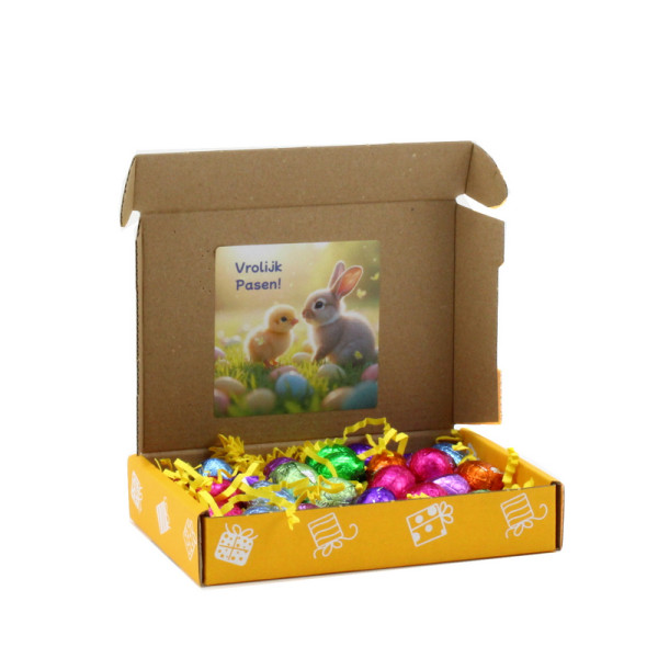 Dit vrolijke brievenbusgeschenk is een echte paasverrassing om iemand fijne paasdagen te bezorgen. In de gele brievenbusdoos ligt een feestelijk nestje van sizzlepak, gevuld met 25 heerlijke chocolade paaseitjes. Aan de binnenzijde van de deksel zorgt een paassticker voor een extra vrolijke finishing touch. Het is mogelijk om de paassticker te personaliseren, bijvoorbeeld met een logo, naam of eigen paasboodschap. Vraag naar de mogelijkheden, wij denken graag met je mee. Besteleenheid: 12 stuks. Gewicht: ± 225 gram Levertijd: in overleg.