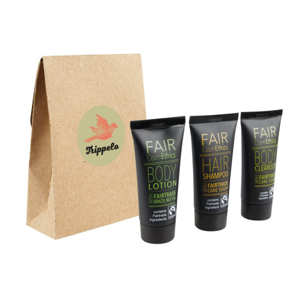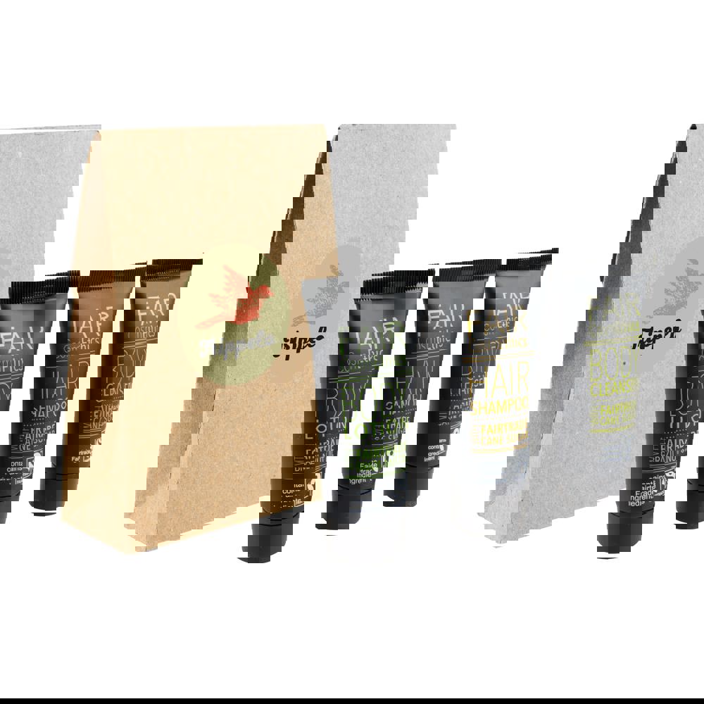 30 ml douchegel 30 ml shampoo en 30 ml bodylotion in een kraft stazakje