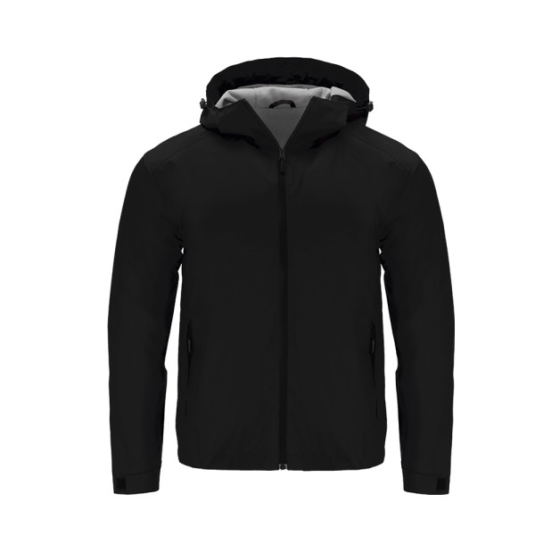 Unisex parka met capuchon, waterdicht en winddicht. Donkergrijs mesh interieur, met verstelbare capuchon met zwarte trekkoord en bijpassende metalen oogjes. Omgekeerde zwarte ritssluiting aan de voorkant, met bijpassende trekker. Twee zijzakken met zwarte rits, bijpassende treklipjes en een binnenzak. Verstelbare manchetten met zwart klittenband.
